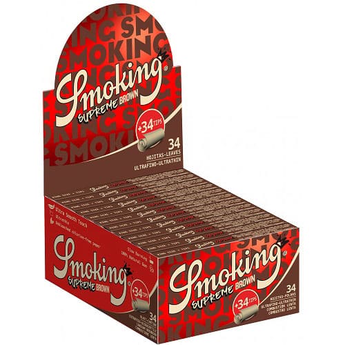 SMOKING SUPREME BROWN ULTRATHIN KING SIZE SLIM LUNGO CARTINE 34 NON RAFFINATO FOGLIE + 34 FILTRI DI CARTA NON RAFFINATO CON 6 PERFORAZIONI PER CONFEZIONE CONNOISSEUR SCATOLA COMPLETA 24 PEZZI